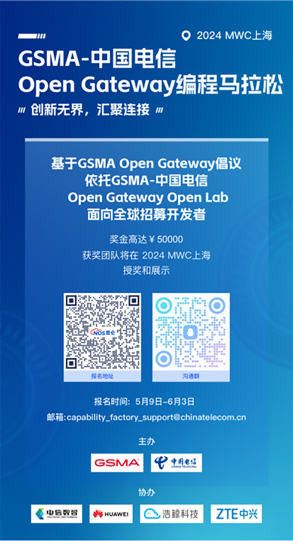 授牌儀式上,雙方宣布Open Lab成立后的首次大型活動(dòng) “GSMA-中國(guó)電信Open Gateway編程馬拉松大賽”正式啟動(dòng)。大賽以“創(chuàng)新無(wú)界,匯聚連接”為主題,面向全球招募開(kāi)發(fā)者,基于Open Gateway標(biāo)準(zhǔn)API、昆侖能力工廠,利用在線或離線開(kāi)發(fā)工具完成軟件開(kāi)發(fā),共同宣傳Open Gateway倡議,推廣網(wǎng)絡(luò)標(biāo)準(zhǔn)化編程的理念,為行業(yè)應(yīng)用提供更豐富的創(chuàng)意和思路。