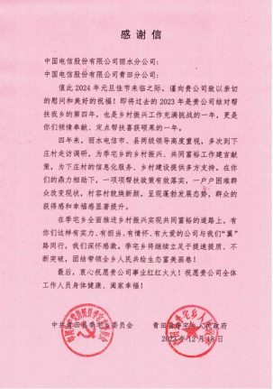 (青田縣季宅鄉(xiāng)政府致麗水電信的感謝信)
