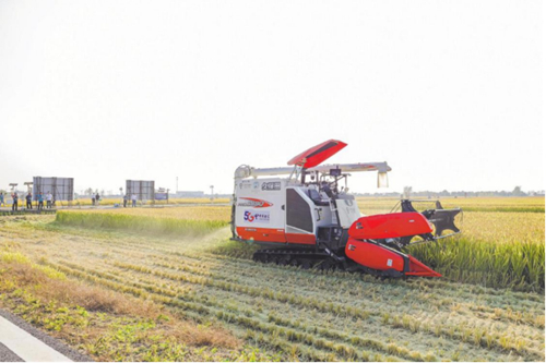中國(guó)電信5G無(wú)人收割機(jī)在江蘇省興化市現(xiàn)代農(nóng)業(yè)產(chǎn)業(yè)園收割水稻。劉昊安/攝