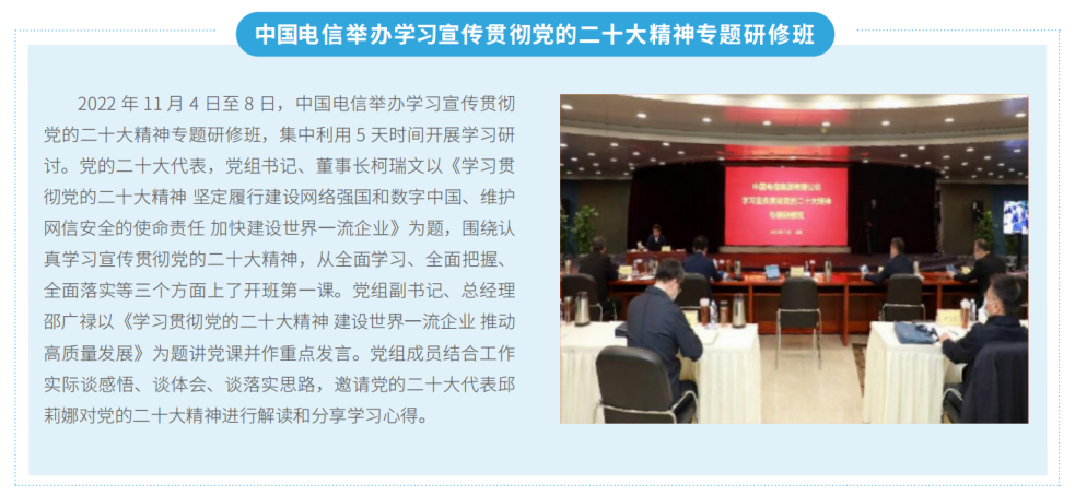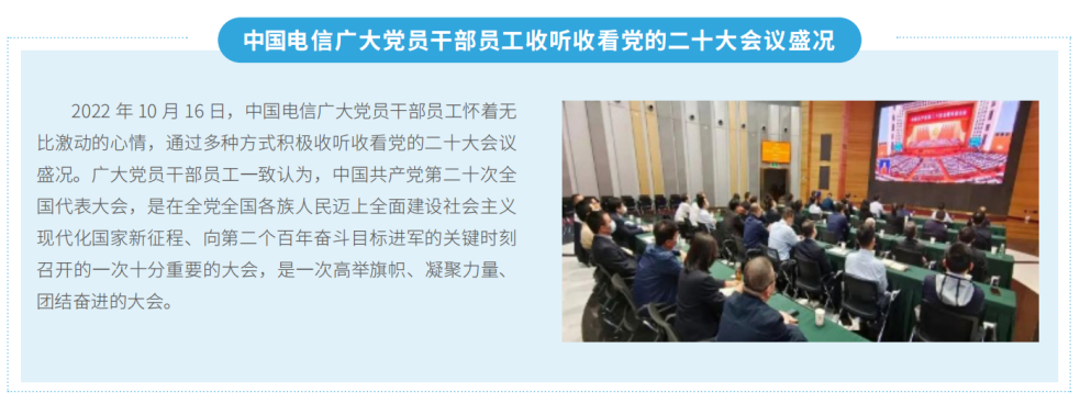 黨的二十大開(kāi)幕當(dāng)天,中國(guó)電信組織全集團(tuán)黨員干部員工通過(guò)多種方式積極收聽(tīng)收看黨的二十大會(huì)議盛況。黨的二十大召開(kāi)后,公司黨組第一時(shí)間對(duì)全集團(tuán)學(xué)習(xí)宣傳貫徹黨的二十大精神工作作出全面安排部署,迅速掀起學(xué)習(xí)宣傳貫徹?zé)岢薄9军h組先后11次開(kāi)展專(zhuān)題學(xué)習(xí)研討,原原本本、逐字逐句地研讀黨的二十大報(bào)告和黨章以及有關(guān)決議文件,分享體會(huì)、交流收獲。公司黨組成員帶頭深入分管條線、所在黨支部和黨建聯(lián)系點(diǎn)講黨課、作宣講,以上率下引導(dǎo)黨員干部全面學(xué)習(xí)、全面把握、全面落實(shí)黨的二十大精神。舉辦專(zhuān)題研修班和線上學(xué)習(xí)專(zhuān)題班等,抓好領(lǐng)導(dǎo)干部集中輪訓(xùn),開(kāi)展全員培訓(xùn)。創(chuàng)新宣傳宣講方式,開(kāi)辟學(xué)習(xí)宣傳黨的二十大精神專(zhuān)題專(zhuān)欄,深入宣傳各級(jí)黨組織學(xué)習(xí)貫徹黨的二十大精神的新實(shí)踐、新成效、新經(jīng)驗(yàn)、新風(fēng)貌。靈活運(yùn)用“網(wǎng)絡(luò)講堂”“微宣講”等形式,開(kāi)展“萬(wàn)名書(shū)記講黨課”活動(dòng),邀請(qǐng)黨的二十大代表柯瑞文、邱莉娜和專(zhuān)家學(xué)者宣講,推動(dòng)黨的二十大精神直達(dá)基層、直通一線、走進(jìn)員工。
