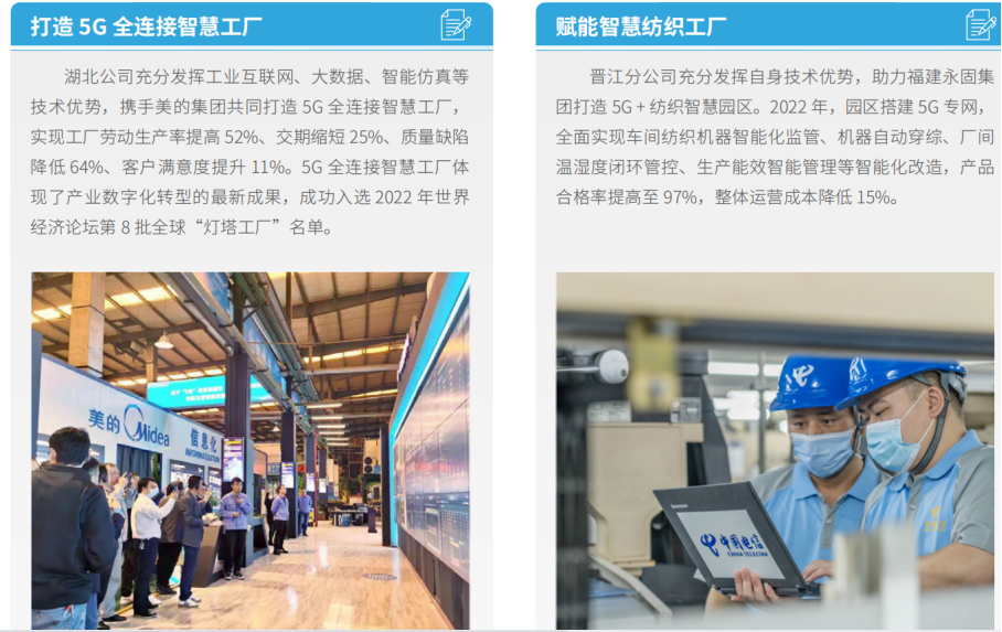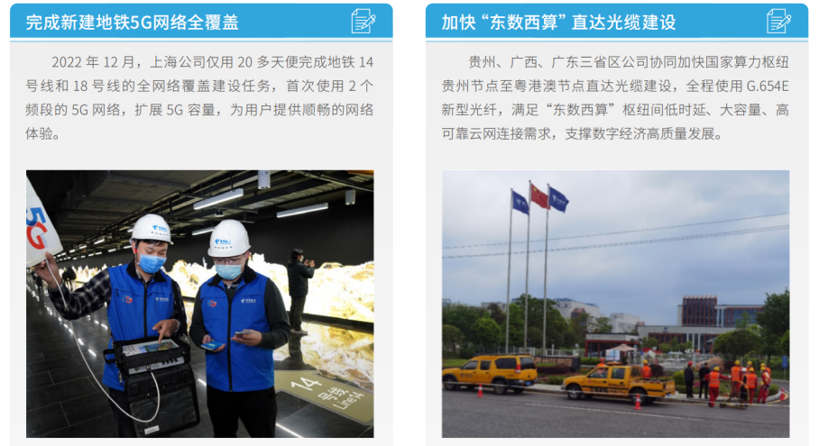 中國電信加快雙千兆網(wǎng)絡建設。移動網(wǎng)方面,全面建成了全球首張規(guī)模最大、網(wǎng)速最快的5G  SA共建共享精品網(wǎng)絡, 開通5G共享基站100萬站,實現(xiàn)高中低多頻協(xié)同等技術(shù)突破,基本實現(xiàn)發(fā)達鄉(xiāng)鎮(zhèn)以上區(qū)域的室外連續(xù)覆蓋、高流量行政 村熱點覆蓋、中高業(yè)務場景的室內(nèi)深度覆蓋,為全球5G  SA部署提供了應用示范。寬帶網(wǎng)方面,建成全球最大的千兆光 網(wǎng),新建10G PON端口297萬個,千兆光網(wǎng)覆蓋超過2.9億家庭住宅,有效支撐千城千兆業(yè)務發(fā)展。