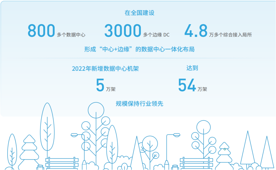 中國電信積極布局算力基礎設施,在京津冀、長三角、粵港澳、成渝等區(qū)域中心節(jié)點,打造支持大規(guī)模、多可用 區(qū)的新一代云底座天翼云4.0,為用戶提供高可用的云服務。在241個城市建設“一城一池”節(jié)點,為客戶提供更好的數(shù) 據(jù)本地化、超低時延分布式云服務。強化行業(yè)專屬云與客戶私有云能力建設,為千行百業(yè)數(shù)字化轉(zhuǎn)型打造安全可信的 云底座。在全國建設800多個數(shù)據(jù)中心、3000多個邊緣DC和4.8萬多個綜合接入局所,形成“中心+邊緣”的數(shù)據(jù)中心一 體化布局,2022年新增數(shù)據(jù)中心機架5萬架,總規(guī)模達54萬架,保持行業(yè)領(lǐng)先。