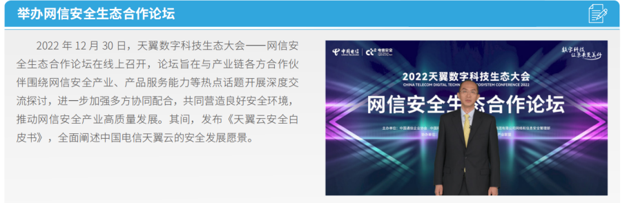 中國電信堅持以人民為中心的發(fā)展思想,加大優(yōu)質(zhì)高效的數(shù)字化產(chǎn)品和服務供給,著力滿足廣大客戶對美好數(shù)字生活的新需求,不斷提高人民群眾的獲得感、幸福感、安全感。堅持全面融云、融AI、融安全、融平臺,提供云網(wǎng)邊端安全深度融合定制,著力推動產(chǎn)業(yè)數(shù)字化加速發(fā)展。