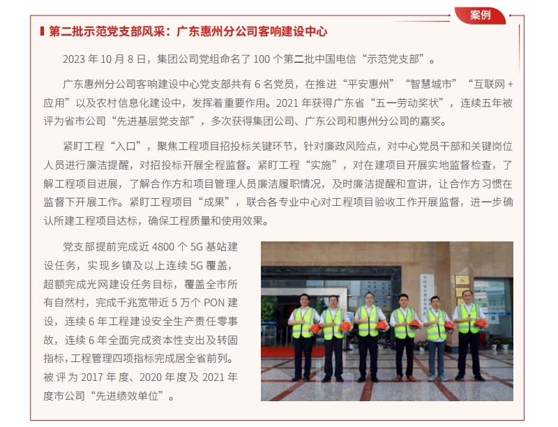 基層組織體系得到新夯實(shí)。中國(guó)電信深入推進(jìn)基層黨建“七抓”工程,全面完成《2019-2023 中國(guó)電信黨員教育培訓(xùn)規(guī)劃》各項(xiàng)重點(diǎn)任務(wù),命名 100 個(gè)第二批集團(tuán)級(jí)示范黨支部,開展示范黨支部風(fēng)采巡禮和展播,帶動(dòng)全集團(tuán)黨組織建設(shè)邁上新臺(tái)階。