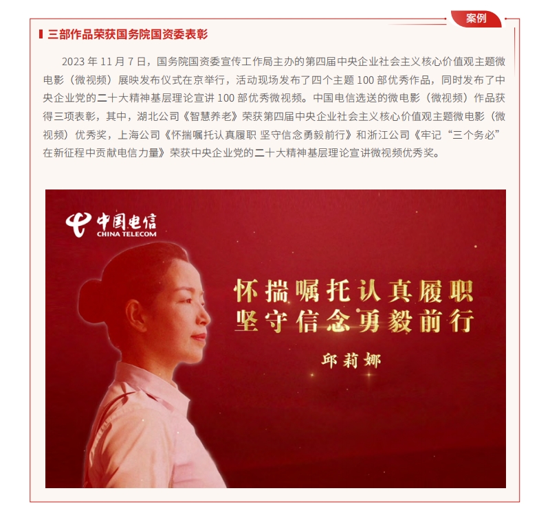 中國(guó)電信持續(xù)開展紅色電信精神宣傳,將紅色電信精神作為黨員干部員工日常教育培訓(xùn)重要內(nèi)容,開展“紅色電信精神課程優(yōu)化認(rèn)證工作坊”活動(dòng)。在中央企業(yè)黨建政研會(huì)發(fā)布的 2023 年度優(yōu)秀課題研究成果中,中國(guó)電信《國(guó)有企業(yè)弘揚(yáng)新時(shí)代企業(yè)家精神》榮獲二等獎(jiǎng),《中央企業(yè)全媒體傳播體系建設(shè)研究》《新時(shí)代青年科技工作者思想政治工作評(píng)價(jià)體系研究》榮獲三等獎(jiǎng)。