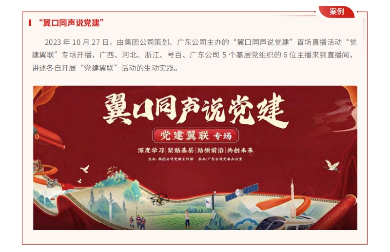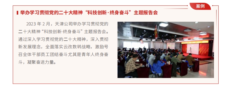 工作機(jī)制建設(shè)邁出新步伐。圍繞產(chǎn)業(yè)鏈供應(yīng)鏈創(chuàng)新鏈深入開展“黨建翼聯(lián)”活動(dòng) 1 萬(wàn)多次;加強(qiáng)“黨建 +”機(jī)制研究,形成課件在全集團(tuán)推廣應(yīng)用;發(fā)布上海公司“五小載體”、陜西公司“黨委爭(zhēng)星”等 14項(xiàng)基層單位創(chuàng)新黨建工作機(jī)制的經(jīng)驗(yàn),拓寬基層黨建的平臺(tái)與途徑。圍繞資源共享化和工作集約化,建立集團(tuán)新任職黨務(wù)人員培訓(xùn)專區(qū),建立“翼口同聲說(shuō)黨建”工作經(jīng)驗(yàn)發(fā)布平臺(tái),以“揭榜掛帥”方式開發(fā)精品黨建課 8 門,更加有效支撐服務(wù)基層。