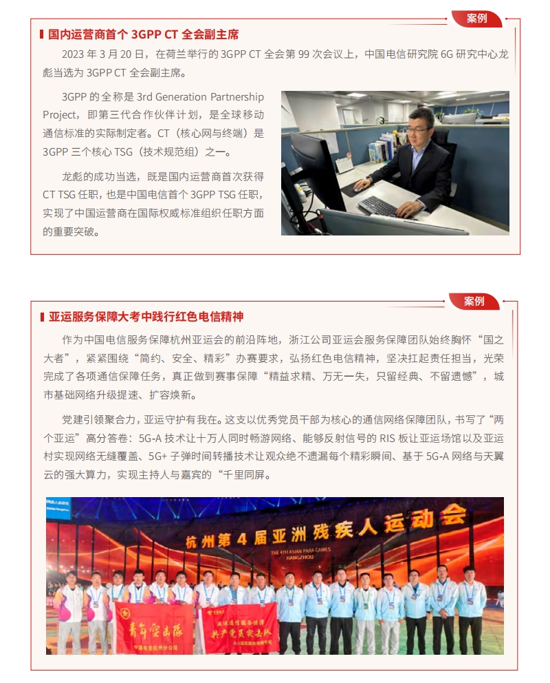 傳承紅色基因彰顯新風(fēng)采。隆重評(píng)選表彰 349 名優(yōu)秀共產(chǎn)黨員、151 名優(yōu)秀黨務(wù)工作者、200 個(gè)先進(jìn)基層黨組織,其中重點(diǎn)宣傳連續(xù) 12 年持續(xù)深化轉(zhuǎn)型,發(fā)展從跟跑到領(lǐng)跑的陜西渭南公司,還有矢志科技自強(qiáng),傳播中國(guó)智慧的研究院龍彪等“兩優(yōu)一先”先進(jìn)事跡。扎實(shí)推動(dòng)黨組織書記帶頭上講堂,講授黨課 1.6萬(wàn)堂,開展百門精品黨課專題展播。把抓重大任務(wù)落實(shí)作為“試金石”,在京津冀抗洪救災(zāi)、亞運(yùn)會(huì)和大運(yùn)會(huì)重保、積石山抗震救災(zāi)等一線,成立臨時(shí)黨支部和黨員突擊隊(duì),關(guān)鍵時(shí)刻更見黨員先鋒模范作用的發(fā)揮。