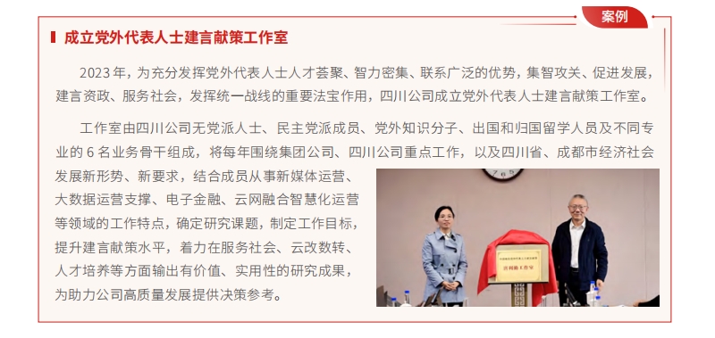 統(tǒng)戰(zhàn)和援疆援藏工作展現(xiàn)新氣象。一是將統(tǒng)戰(zhàn)成員統(tǒng)一納入主題教育工作安排,首次召開全集團(tuán)范圍的黨外代表人士座談會(huì),并組織召開直屬黨委統(tǒng)戰(zhàn)對(duì)象座談會(huì)。二是命名成立 9 個(gè)黨外代表人士建言獻(xiàn)策工作室,開展“愛企業(yè)、獻(xiàn)良策、做貢獻(xiàn)”活動(dòng),形成一批高質(zhì)量調(diào)研成果,93 篇優(yōu)秀成果提交各部門運(yùn)用和參考。三是做好牽頭組織工作,開展對(duì)口支援“十四五”規(guī)劃中期評(píng)估,推動(dòng)援疆援藏援青援贛各項(xiàng)工作扎實(shí)落實(shí),新疆公司連續(xù) 5 年獲得自治區(qū)定點(diǎn)幫扶工作考核最高等次“好”,西藏公司獲評(píng)自治區(qū)級(jí)民族團(tuán)結(jié)進(jìn)步模范單位。