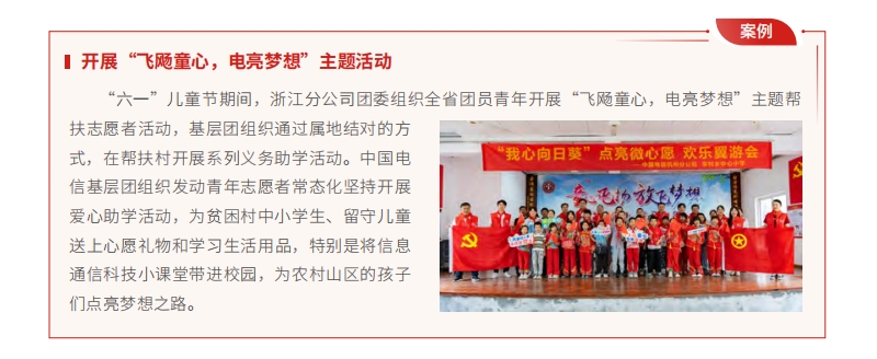 加強(qiáng)青年政治引領(lǐng),助力青年成才成長(zhǎng)。全面推進(jìn)團(tuán)員和青年主題教育,并加強(qiáng)與第二批主題教育的協(xié)同推進(jìn),相關(guān)經(jīng)驗(yàn)在團(tuán)中央、中央企業(yè)團(tuán)工委簡(jiǎn)報(bào)上刊發(fā)。深化黨建帶團(tuán)建,認(rèn)真落實(shí)國(guó)資委黨委《關(guān)于加強(qiáng)中央企業(yè)黨建帶團(tuán)建工作的意見》,各級(jí)黨組織從體制機(jī)制和資源配置上關(guān)心和支持青年工作。全力推進(jìn)青年“兩大工程”,“青馬工程”已納入中國(guó)電信黨校干部教育序列,并建立了“2355”培養(yǎng)模式,集團(tuán)總部及各二級(jí)單位共舉辦 3 期青馬工程,培養(yǎng) 2584 名青馬學(xué)員;抓實(shí)青年精神素養(yǎng)提升工程,做到集團(tuán)全覆蓋,并被作為中央企業(yè)青年精神素養(yǎng)提升工程 8 家試點(diǎn)單位之一。四是激發(fā)青春激情和貢獻(xiàn)青春力量,持續(xù)開展“云改數(shù)轉(zhuǎn)·青春領(lǐng)領(lǐng)航”活動(dòng),組建戰(zhàn)新類和科創(chuàng)類青年突擊隊(duì),成立青創(chuàng)工作室,擦亮“隊(duì)、號(hào)、手、崗、賽”青字號(hào)品牌;深入推進(jìn)四位一體青創(chuàng)工作體系,舉辦 2023 年青年創(chuàng)新創(chuàng)意大賽暨“i 創(chuàng)”黑馬大賽,評(píng)選第三批集團(tuán)青年“翼創(chuàng)未來(lái)”工作坊。全年榮獲全國(guó)級(jí)團(tuán)青類榮譽(yù) 32 項(xiàng),省部級(jí)榮譽(yù) 200 多項(xiàng)。