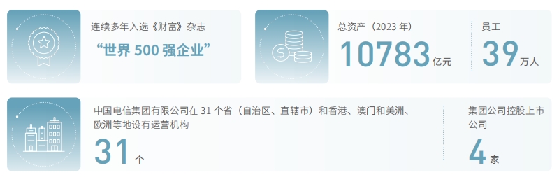 中國電信集團(tuán)有限公司是中國特大型通信運(yùn)營企業(yè),連續(xù)多年入選《財(cái)富》雜志“世界 500 強(qiáng)企業(yè)”,主要經(jīng)營移動(dòng)通信、互聯(lián)網(wǎng)接入及應(yīng)用、固定電話、衛(wèi)星通信、ICT 集成等綜合信息服務(wù)。集團(tuán)公司總資產(chǎn) 10,783 億元,員工 39 萬人。