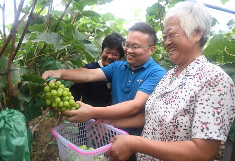 2020 年 9 月 10 日,江蘇省淮安市漣水縣梁岔鎮(zhèn)費(fèi)莊村百畝葡萄園的陽(yáng)光玫瑰葡萄熟了,駐村第一書(shū)記、江蘇公司扶貧隊(duì)隊(duì)員周臘成幫助種植戶采摘新鮮的葡萄并打包裝箱發(fā)貨